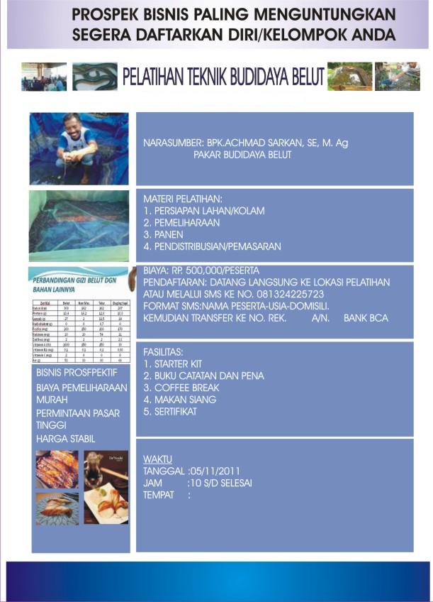 Bibuka pendaftaran DIKLAT BUDIDAYA BELUT untuk pelaksanaan tanggal 07/12/2011, segera daftarkan diri anda. Hanya untuk 20 orang.